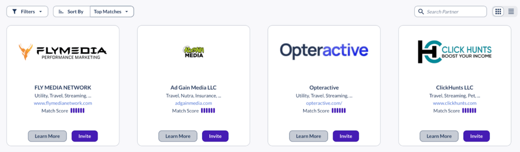 One of the best things about Everflow is the curated marketplace, where you can filter through potential partners that are the best match for your business. You can sort by “top match,” which lets you see the best fits first, but you can also filter your recruitment by type (influencer, deal site, paid placements, in-app ads, and more).